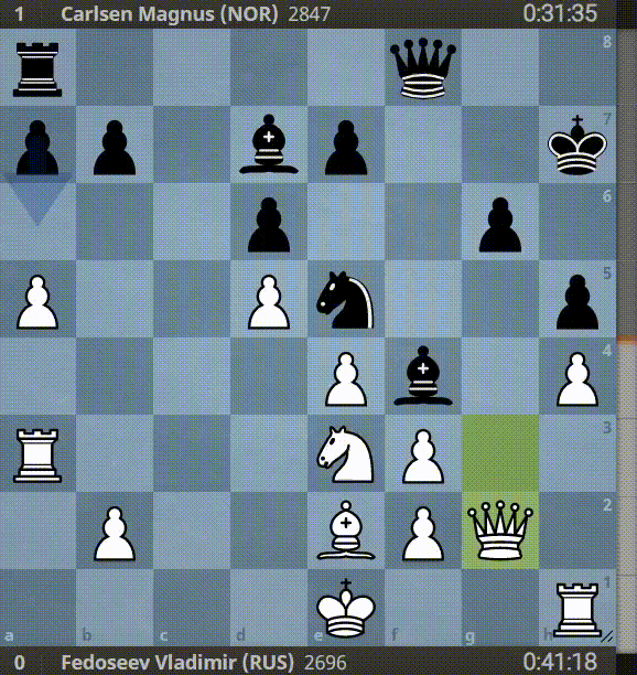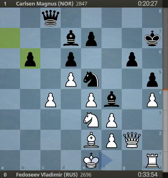 В тоже время Карлсен переводит акцент атаки на ферзевый фланг, где вся защита белых держится на одной ладье. Долго она не могла удерживать натиск соперника и была быстро разменяна.