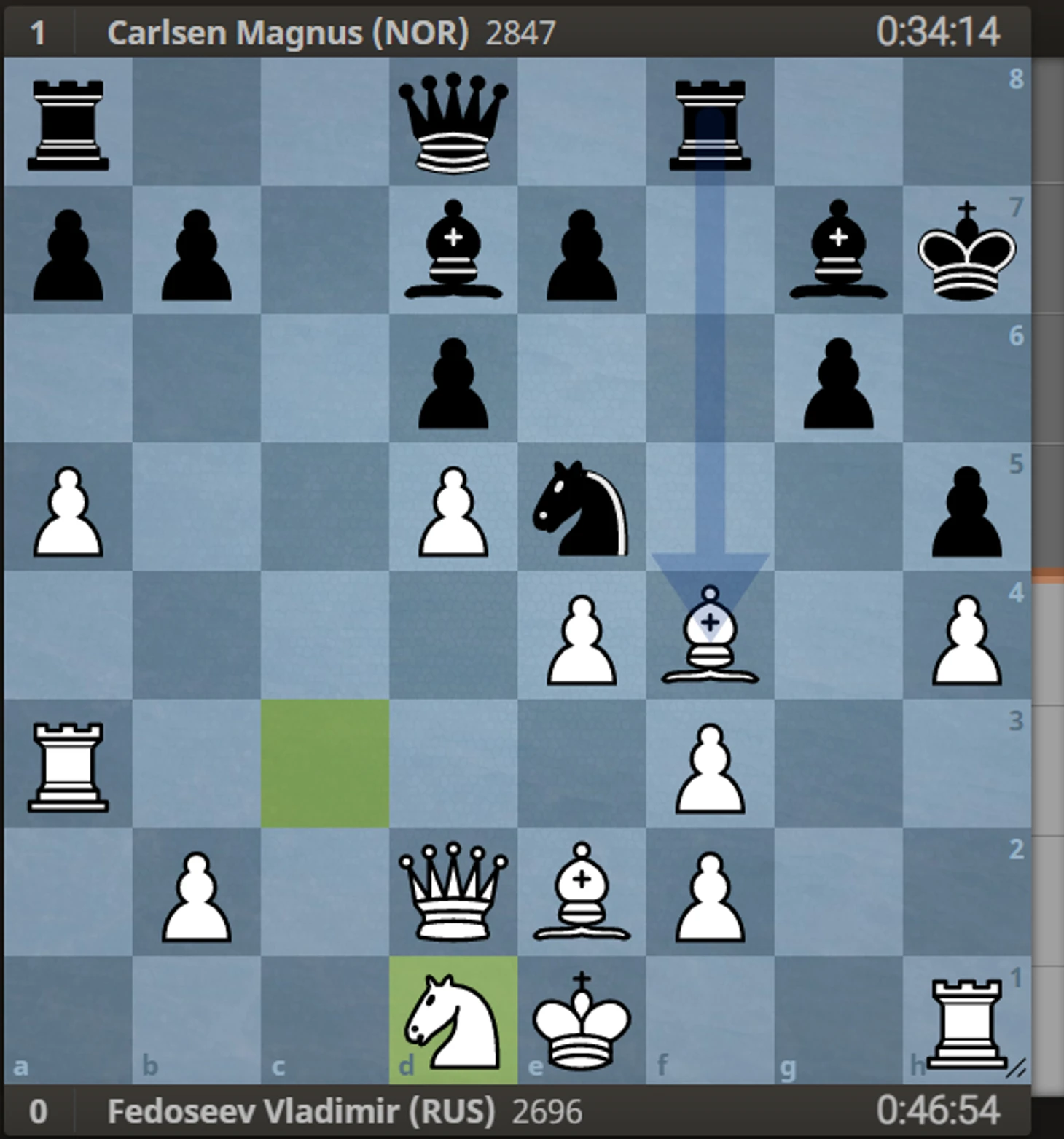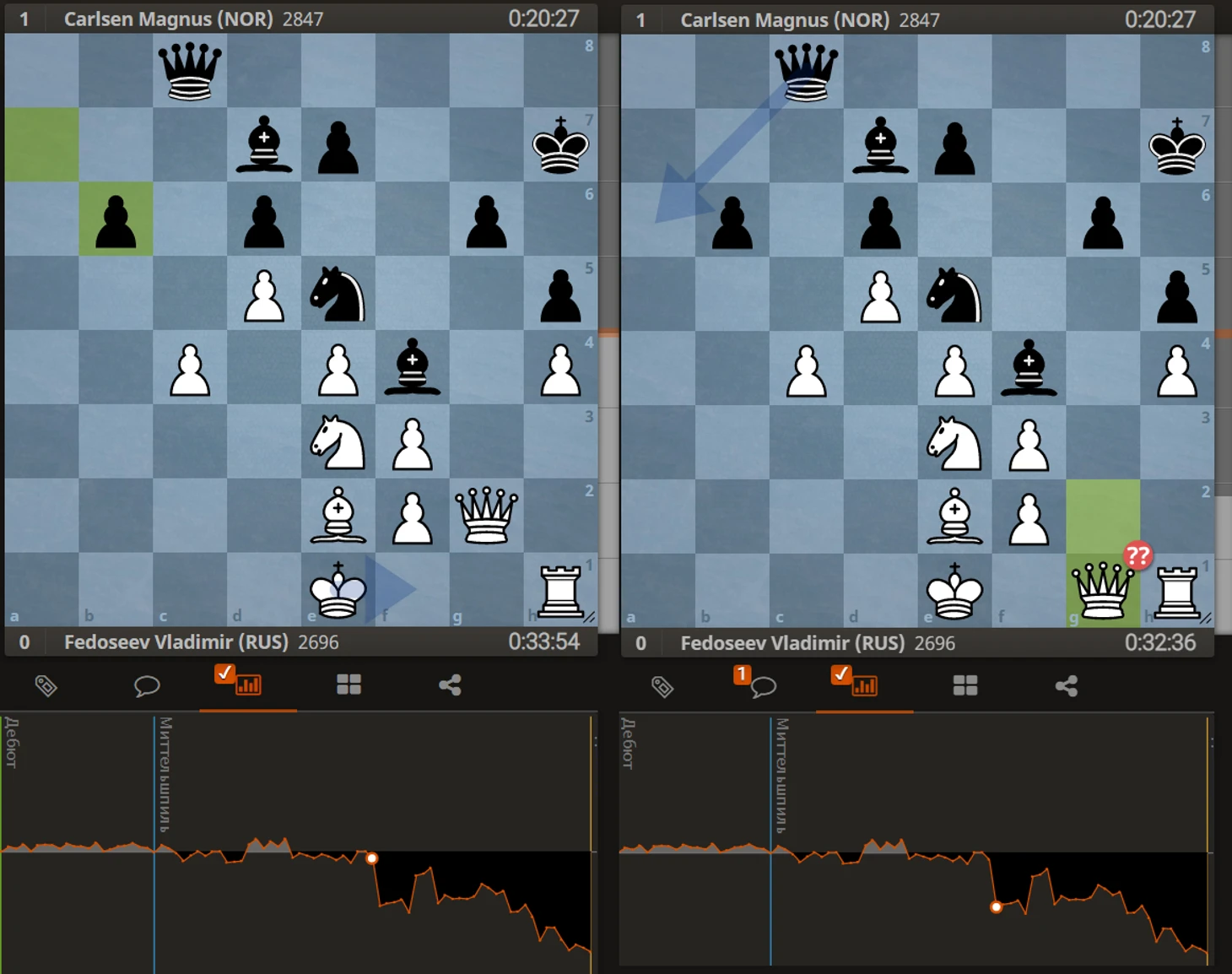 Теперь ферзевый фланг расчищен для атаки черных и ферзь уже готов залезть в стан соперника - над Федосеевым нависла реальная угроза поражения.