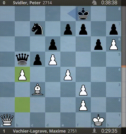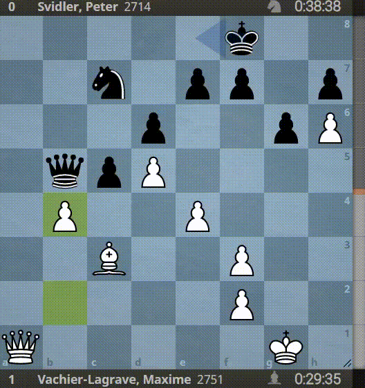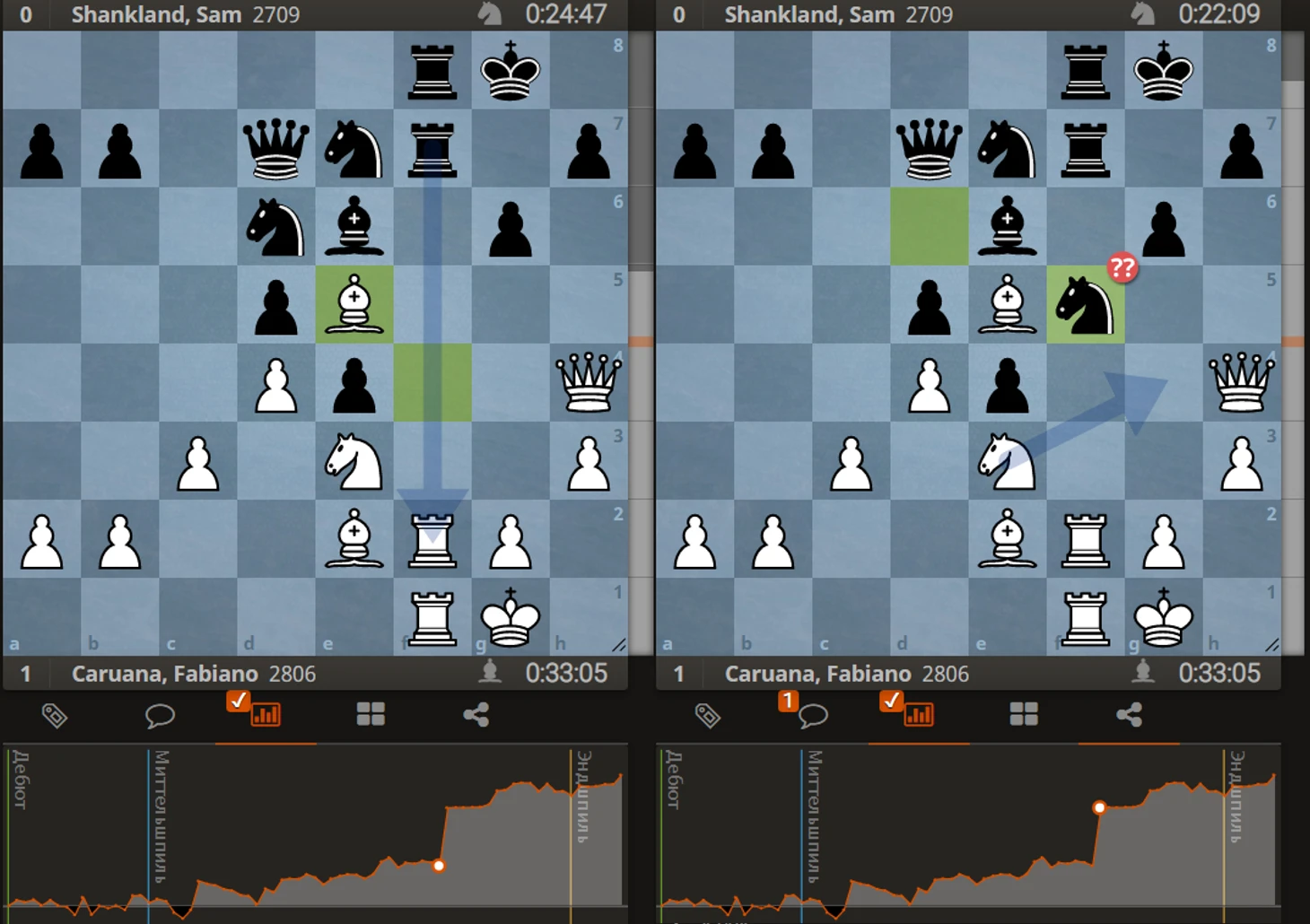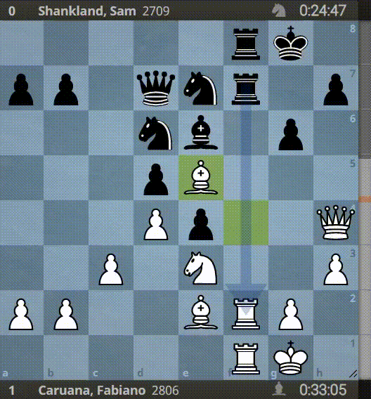 Белые оставляют ферзя под боем, но забирать его нельзя из-за мата 29.Кh6++. Затем Фабиано пошел на жертву коня, но взамен организовал победную атаку на королевском фланге.