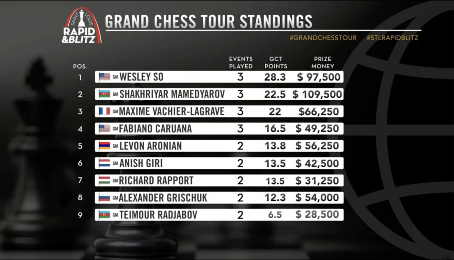 Однако только три из них имеют реальные шансы на победу в общем зачете Grand Chess Tour 2021. Речь идет о Максиме Вашье-Лаграве, Шахрияре Мамедьярове и Уэсли Со. Уэсли является лидером GCT, но конкуренты отстают всего на 6 и 6.5 очков.