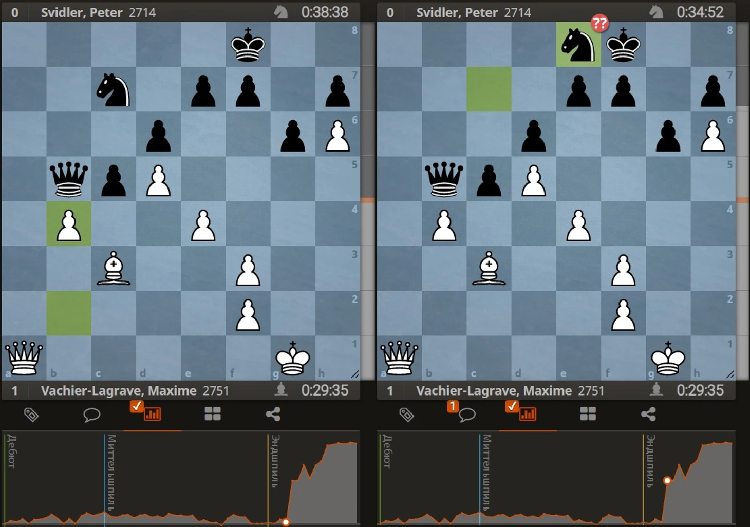 Партия мирно шла к ничейному исходу, как вдруг Петр допустил ошибку ходом 25..Ке8