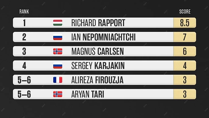 Возить этот эндшпиль пришлось бы очень долго, поэтому Сергей решил поберечь силы на сегодняшний игровой день. Благодаря трем набранным очкам Непо вышел на чистое 2-е место в турнирной таблице Norway Chess.
