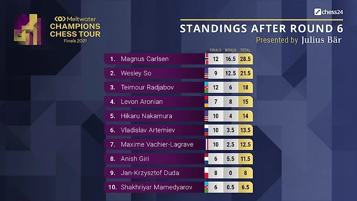 До завершения Гранд-финала осталось всего три раунда, поэтому уже сегодня Магнус Карлсен может досрочно гарантировать себе первое место.