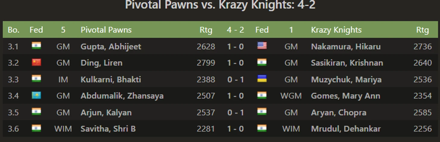 Хикара Накамура прогнозировано обыграл индийского шахматиста Абхиджит Гупта и счет матча был ничейным - 3:3.