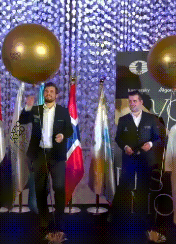 Сегодня состоялась жеребьевка первой партии матча за звание чемпиона мира по шахматам. Организаторы сделали это достаточно оригинально, с помощью воздушных шаров. Право выбора было предоставлено Магнусу Карлсену и норвежец пробил шар с черными конфетти. Таким образом, его соперник Ян Непомнящий сыграет первую партию белыми фигурами.
