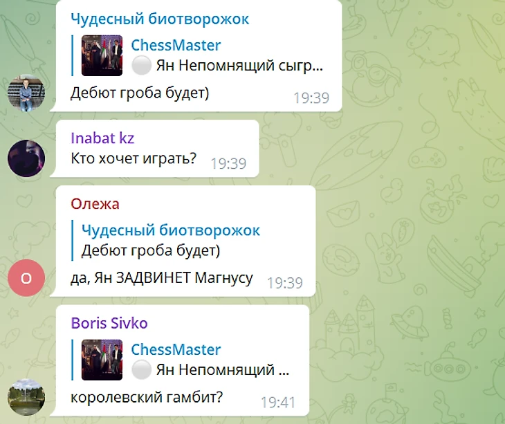 В нашем телеграм-чате сразу начали всплывать самые разные варианты дебютов, которые есть у Яна. Среди них даже дебют Гроба, а почему нет?) Пишите в комментариях свои догадки на счет дебюта в первой партии.