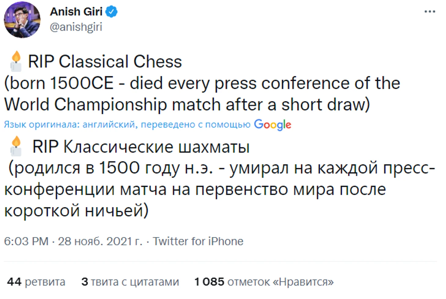Конечно, после третьей ничьей подряд, еще и достаточно непродолжительной по количеству затраченного на ходы времени, любители шахмат заговорили о проблеме постоянных ничьих, особенно в матчах за звание чемпиона мира. Вот такой твит оставил Аниш Гири и как видите, он собрал немало лайков.