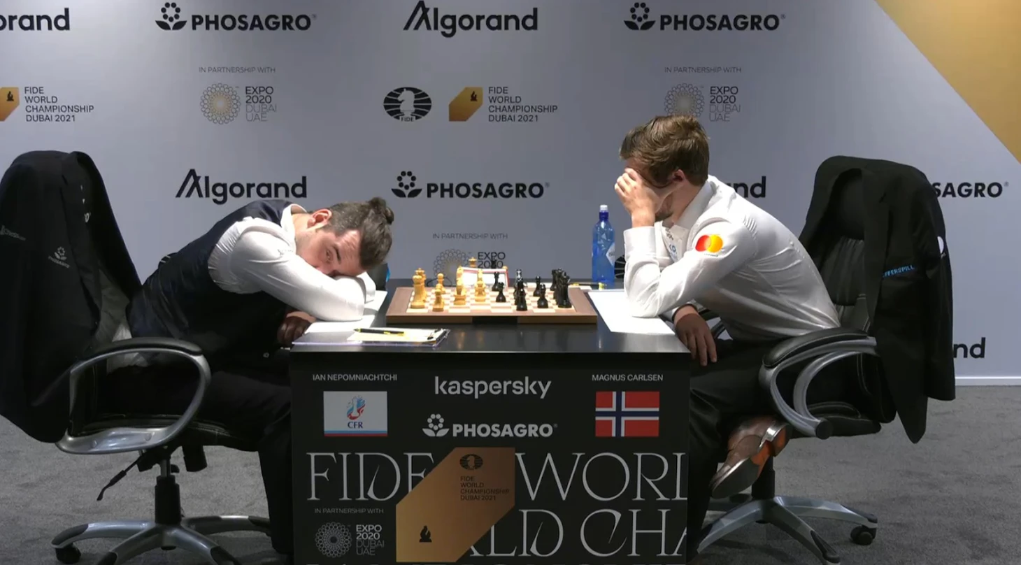 Возможно, шахматисты действительно немного подустали после двух ярких сражений на старте матча, поэтому сегодня они решили не мучать друг друга и согласились на ничью в испанской партии сразу же после 41-го хода белых.