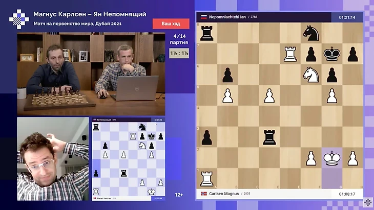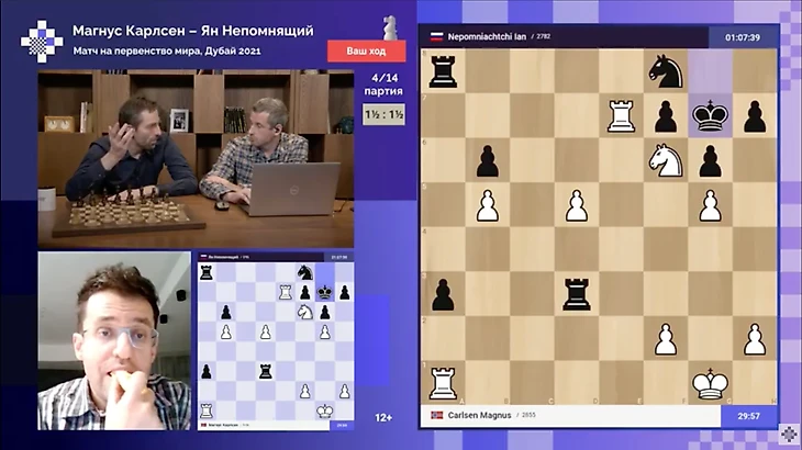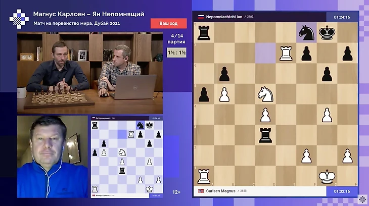 16:35. Пока Карлсен думает над своим 25-м ходом – у белых дилемма: куда отправить своего коня? – гости студии Levitov Chess травят анекдоты. Телекомментатор Дмитрий Губерниев рассказывает, нет, не о биатлоне, а хоккеистах и путешествиях, а Александр Грищук – о хитрых футболистах...