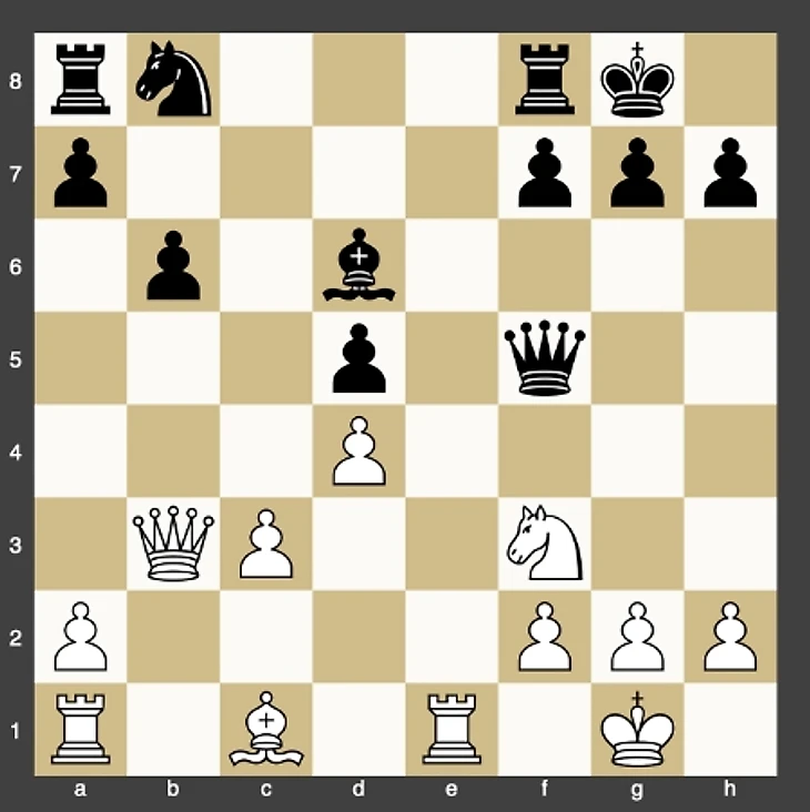 15:40. Соперники довольно быстро исполнили 3.Nxe5 d6 4.Nf3 Nxe4 5.d4 d5 6.Bd3 Bd6 (черные могут играть и 6...Be7 «чтобы мучится», а могут играть жестче на борьбу, как сыграл Ян) 7.O-O O-O 8.c4 c6 9.Re1 Bf5 (одна из табий Русской партии после некоторых размышлений) 10.Qb3 Qd7 11.Nc3 Nxc3 12.Bxf5 Qxf5 13.bxc3 b6 14.cxd5 cxd5. На сегодняшний день – первая линия машины...