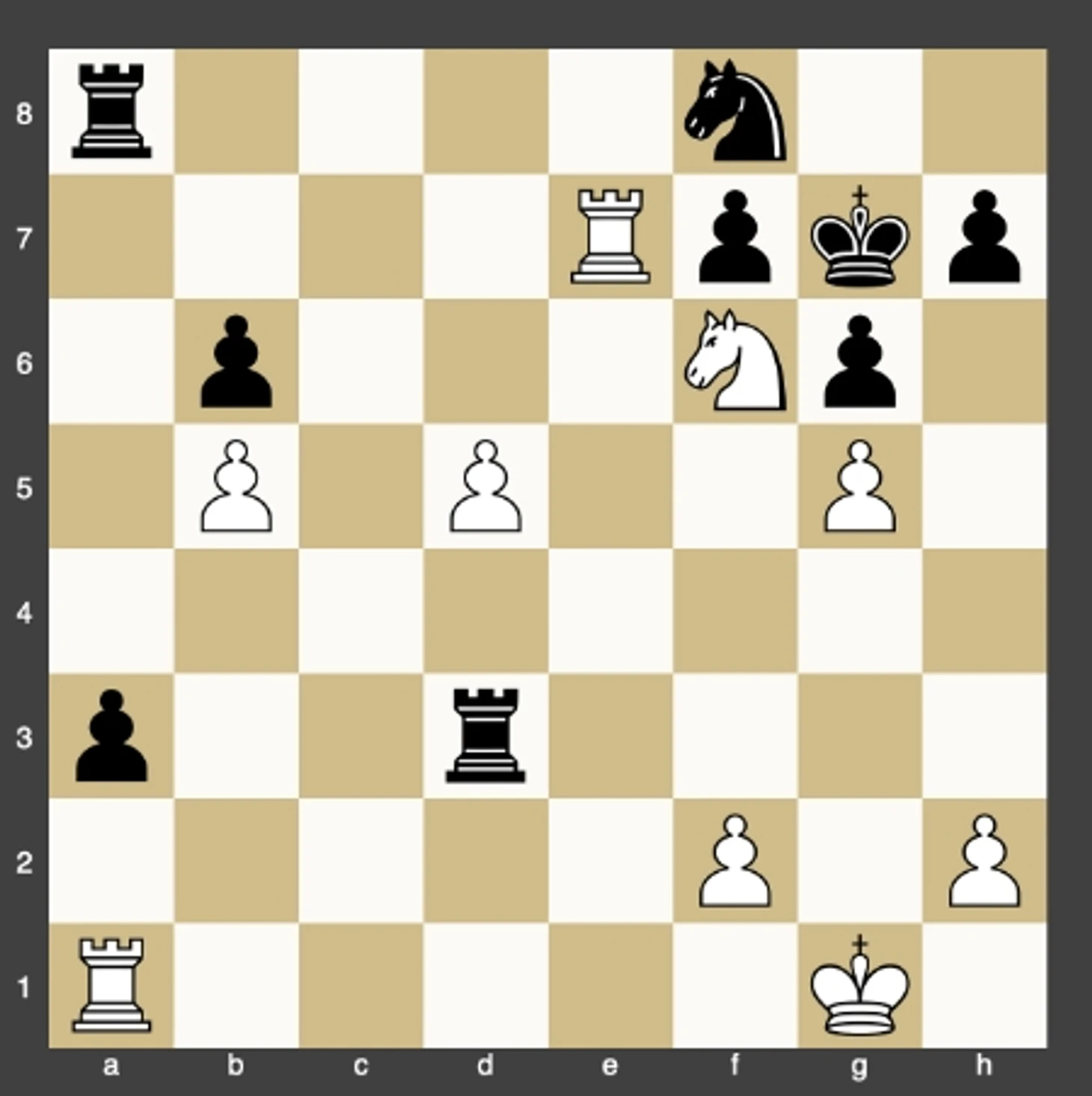 Быстро было исполнено: 25...Kg7 26.Ne8+ Kg8. Король возвращается назад. Можно было отступить на h8, чтобы избежать возможной вилки после 27.d5 Rxd5?? 28.Nf6, с выигрышем ладьи. Грищук даже предложил направить короля на h6, где на полупустой доске тот чувствовал бы себя в порядке.