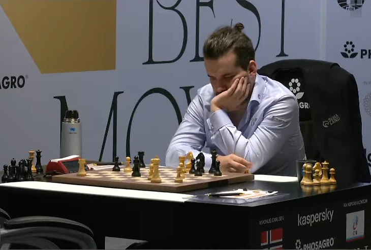 В 3-й партии Непомнящий задумался на 29:45, Карлсен продумал уже больше чем на 33 минут...