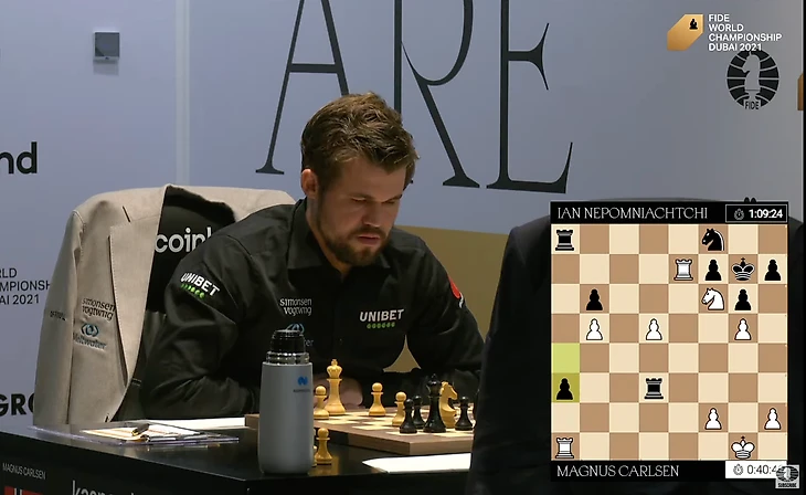 17:35. Магнус задумался уже больше чем на полчаса в поисках возможностей продолжения борьбы!