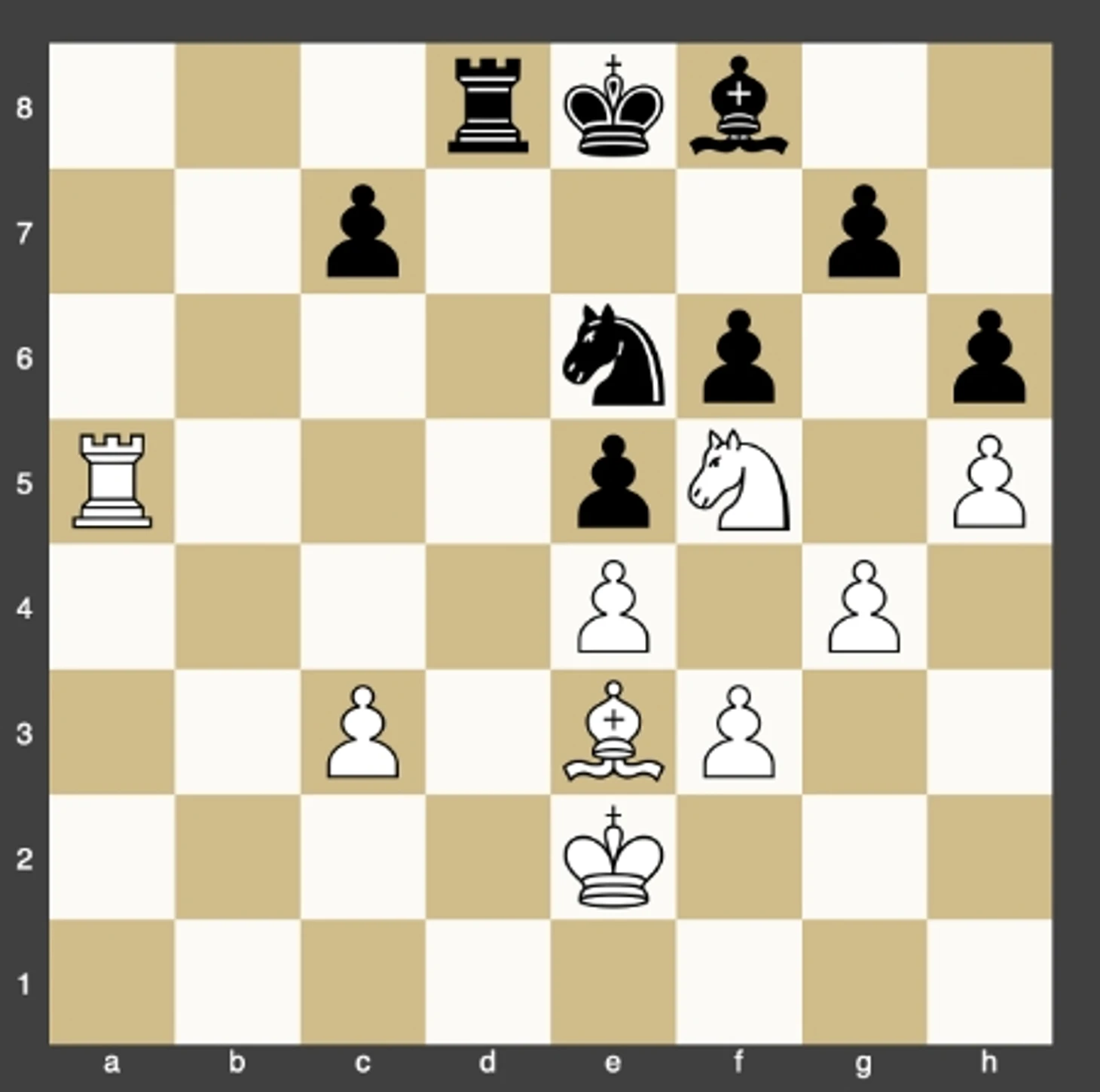 Тем временем, сыграно: 31.f3 f6 32.g4 Kf7 33.h4 Bf8 34.Ke2 Nd6 35.Ncxd6+ Bxd6 36.h5 Bf8 37.Ra5 Ke8.
