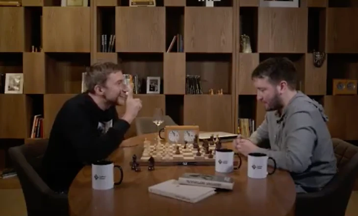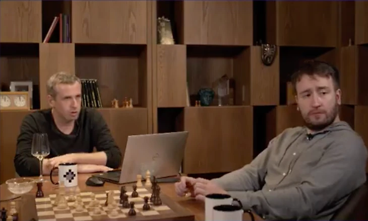 18:30. Пятая партия продолжается, – но гости студии Levitov Chess, участники турнира претендентов 2022 года, Сергей Карякин и Теймур Раджабов в ожидании того, что в Дубае произойдет хоть что-то интересное, сели пока играть в блиц. Хоть кому-то в этот вечер будет по-настоящему весело!