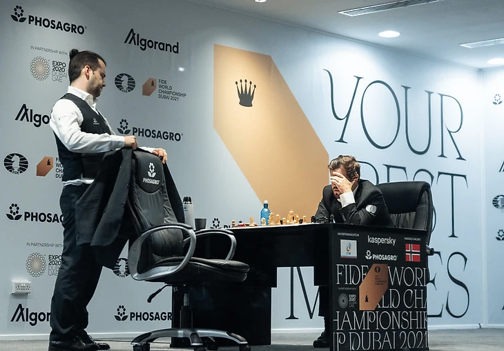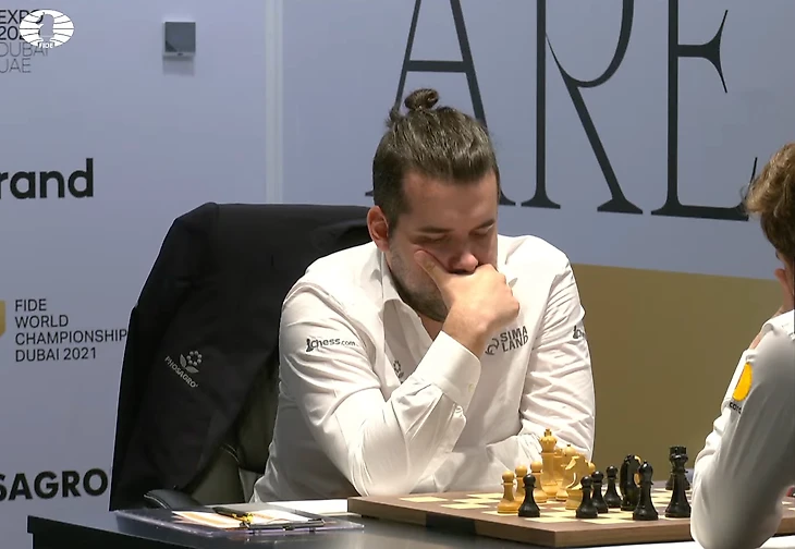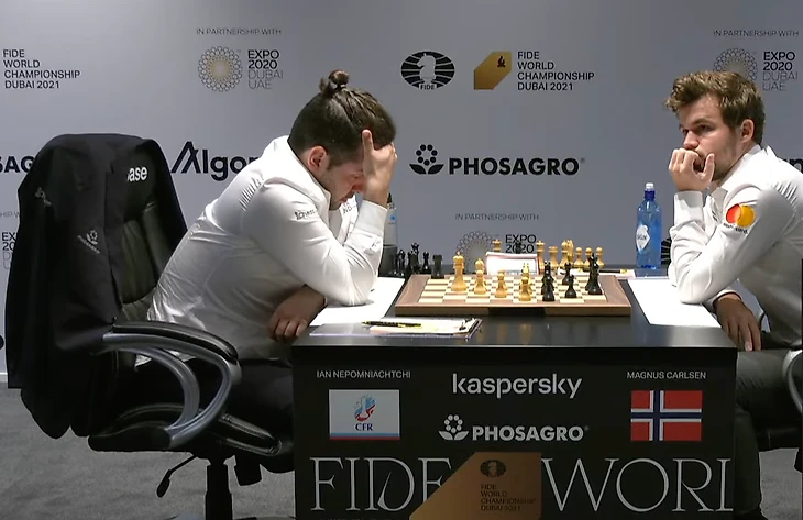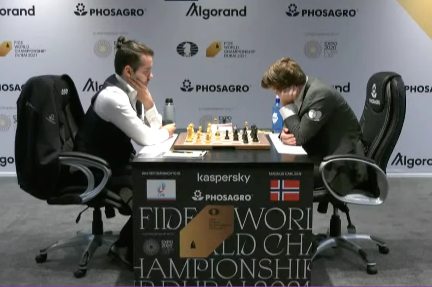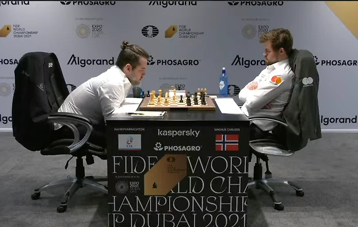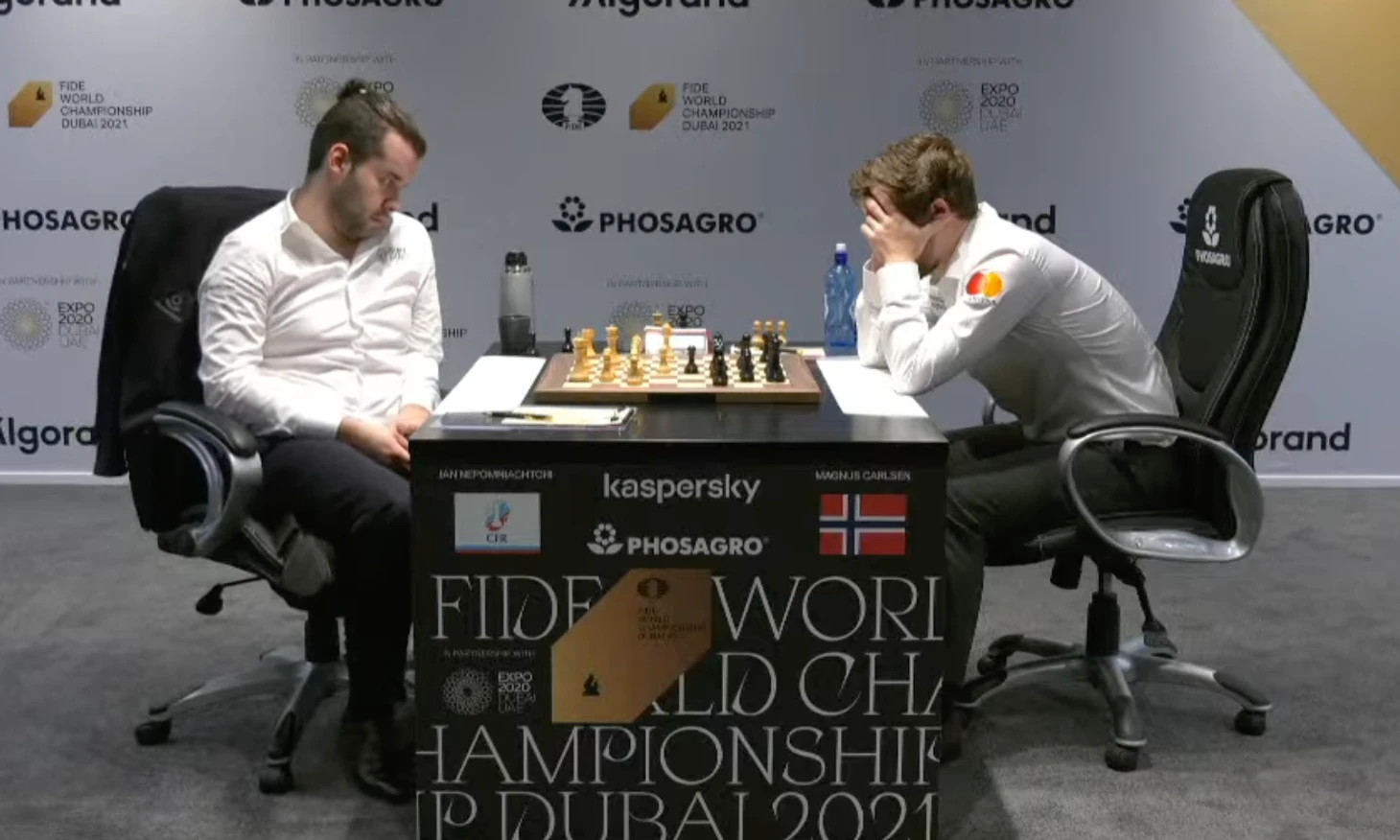 15:25. Приветствуем вас на 5-й партии матча на первенство мира-2021, проходящий на Expo в Дубае (ОАЭ)! Температура воздуха +26, солнечно, с моря дует теплый бриз…