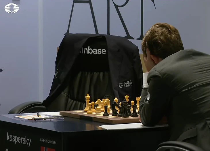 Карлсен не встает из-за столика. Интересно, что пока ни в одной партии... не снимал пиджак!