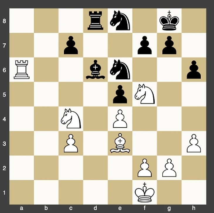 16:15. Чемпион мира быстро сделал ход по первой линии Stockfish – 16...h6, на что почти мгновенно последовало 17.Nf1. Конь белых идет по стандартному «испанскому» маршруту – на g3 или e3, метя на квадраты d5 или f5. Одна из возможностей белых – Ba4 , прогоняя коня с сильной позиции c6.