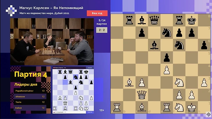 Мы следили за доской вместе с Levitov Chess (на канале можно угадывать ходы соперников во время партии), анализировали ходы и ситуацию (со скринами). Регламент матча за шахматную корону вы найдете в самом низу онлайна.