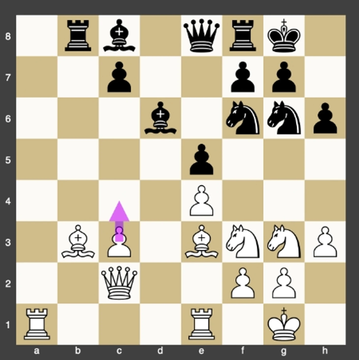 Идея черных крайне проста – начать охоту за белопольным слоном белых: черные хотят сыграть Be6, а если тот уйдет на a4, то Bd7. Но у белых в запасе появляется движение пешки «с».