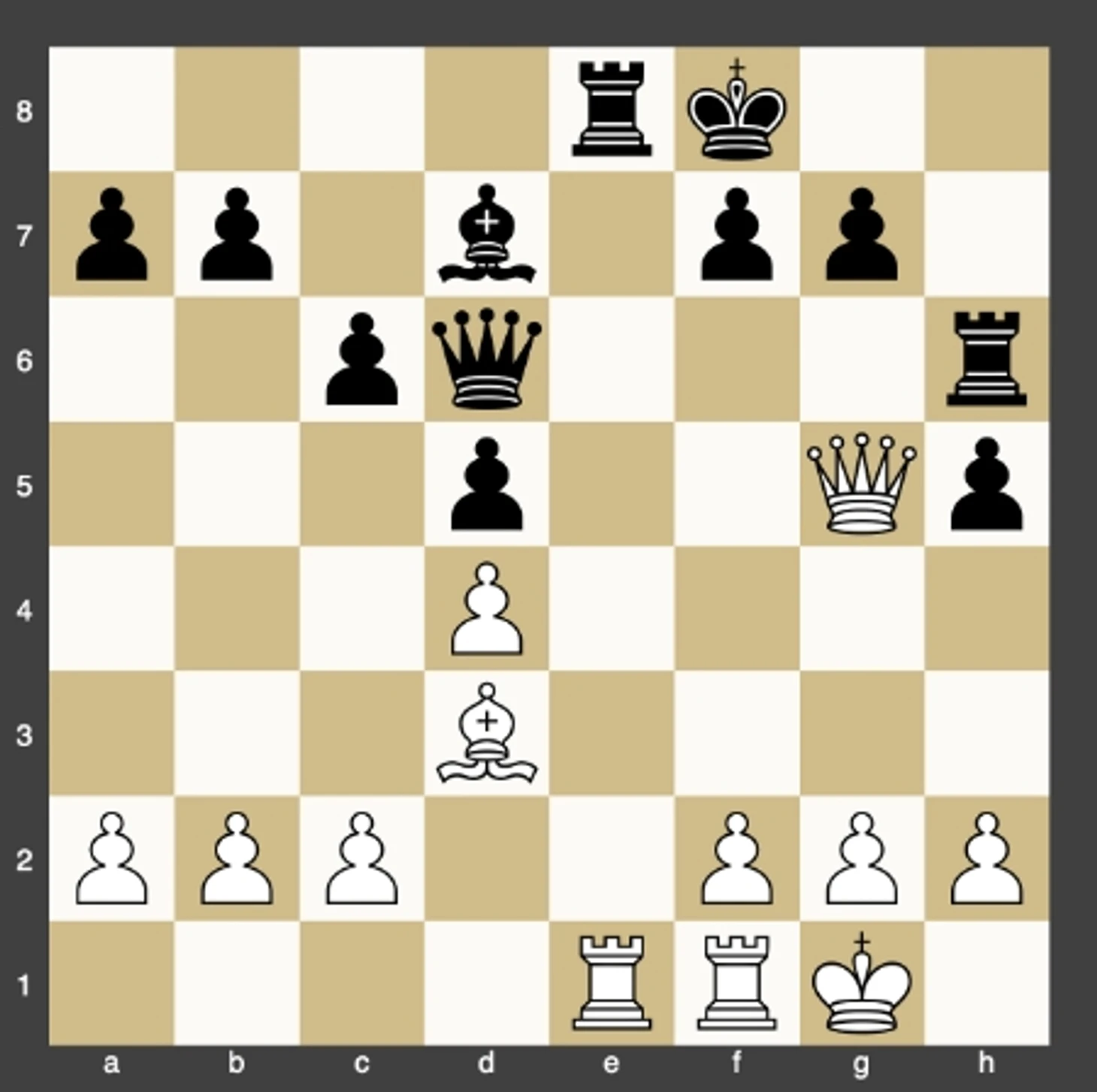 17:25. Так и сыграно: 16.Rxe8+ Bxe8 17.Re1, только Ян избрал умиротворяющее 17...Qf6, предлагая в позиции размен ферзей. Эндшпиль после этого чуть лучше у белых за счет слона (все пешки черных стоят на полях цвета слона), но в миттельшпиле у Карлсена намного больше шансов за счет плохого положения черного короля и их ослаблений на обоих флангах + в руках у них единственная линия.