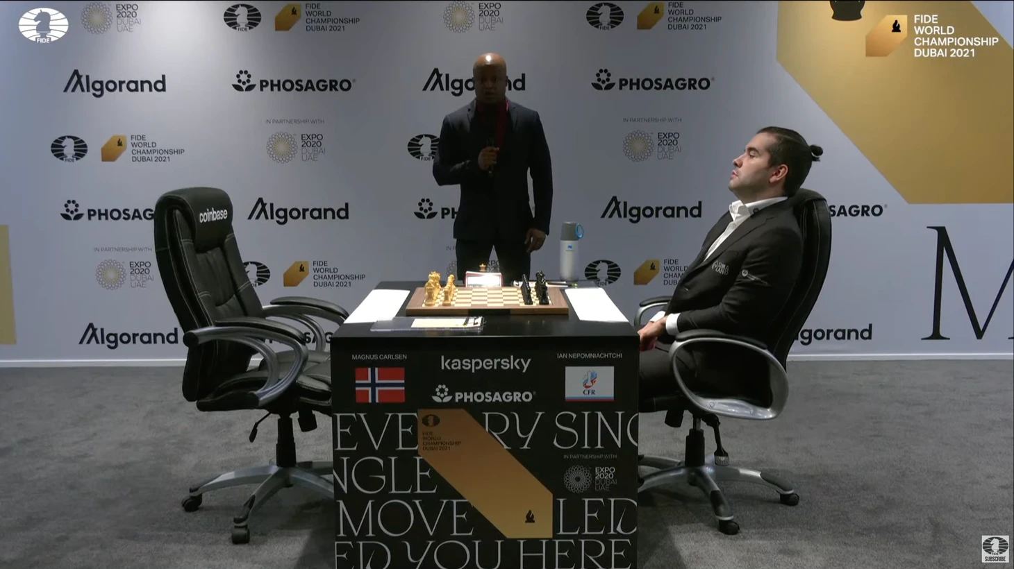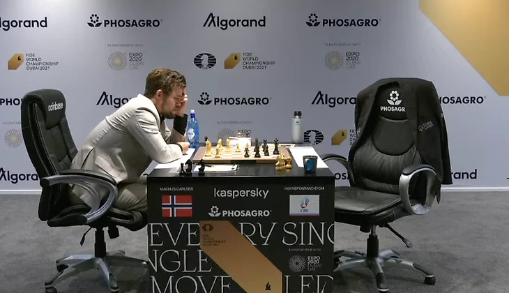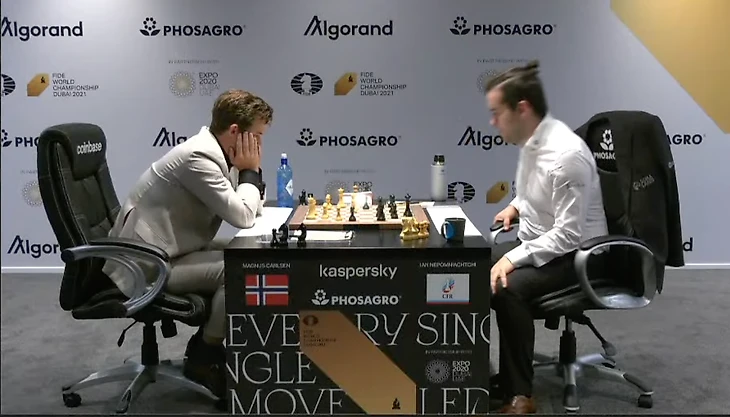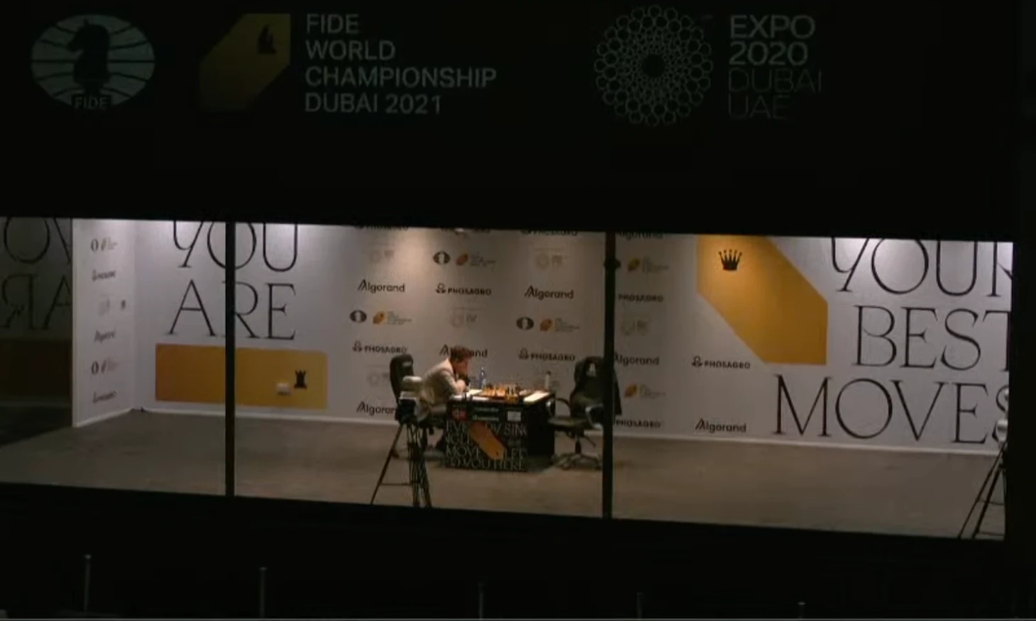 Редкий для матча в Дубае момент: Непомнящий думает, а Карлсен ушел в свою комнату отдыха...