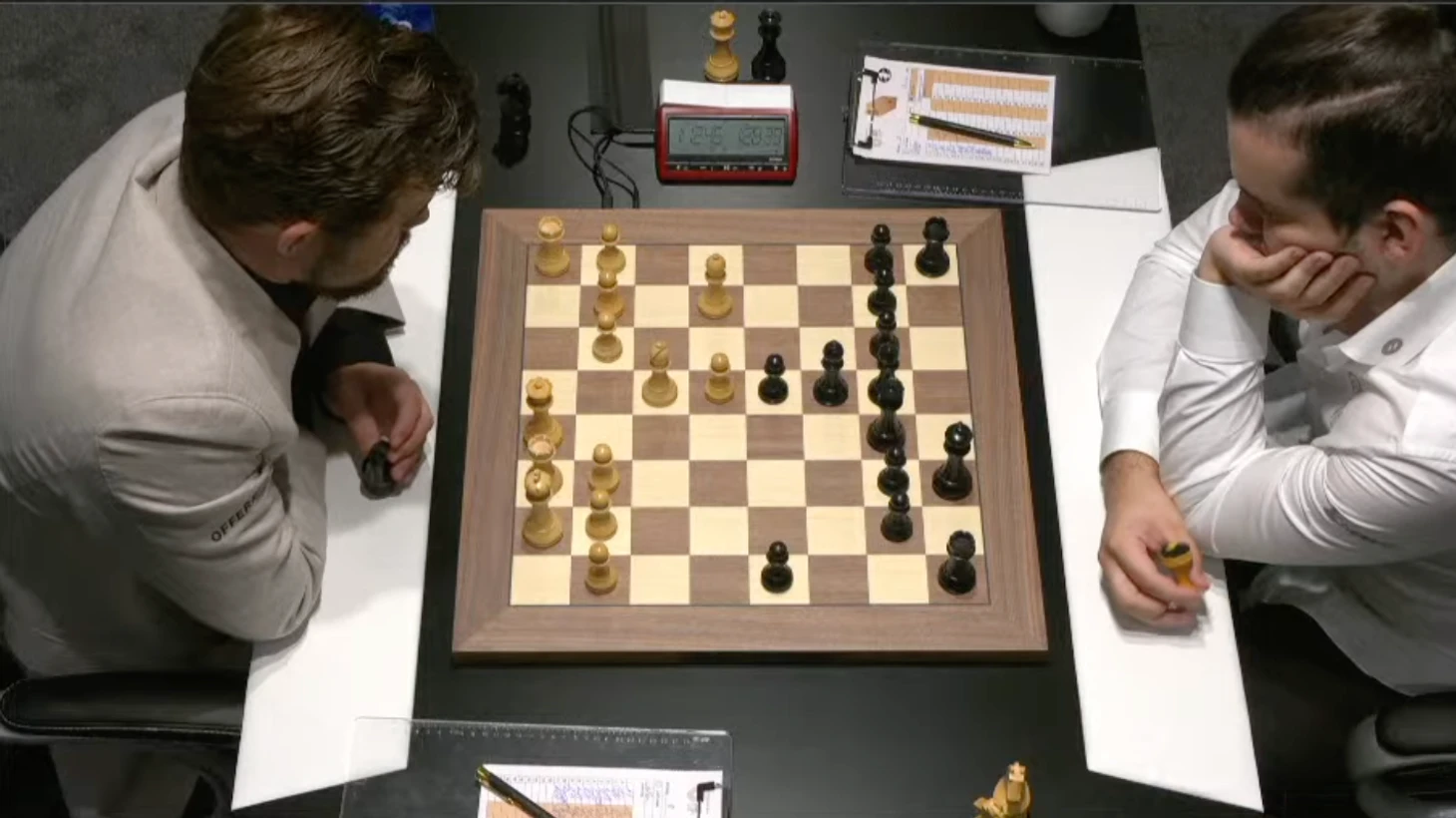 16:50. Ян решительно отступил королем – 10...Kf8, а потом быстро было сыграно 11.Bb4 Qe7. Ферзь пригодился белым и для выгодного им размена чернопольных слонов. Кажется, Магнус думал не зря!