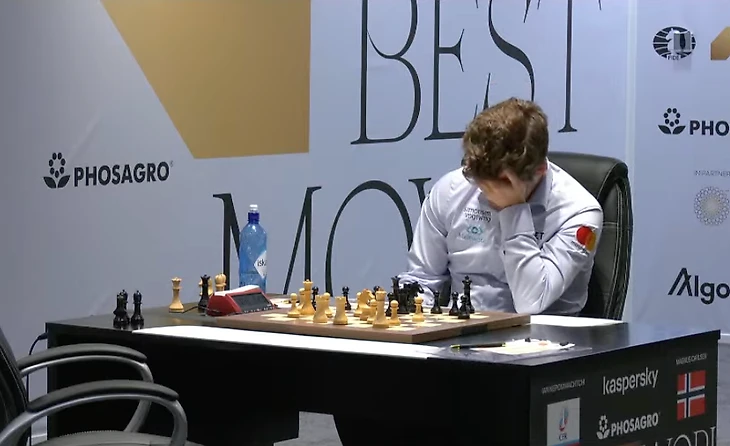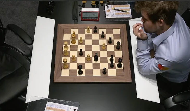 16:05. Добавили еще парочку ходов – 9.Nc2 O-O 10.Be3. Магнус задумался. Пытается заставить себя работать. Он завис за доской минут на десять... Stockfish дает белым крошечный перевес: +0.24.