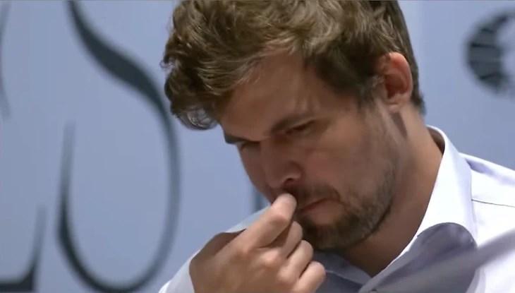 17:15. Магнус в одиночестве за столиком. Вряд ли ему сложно посчитать приведенный вариант... Он видит и его, и десятки других. По при этом выглядит как самый несчастный человек на свете.