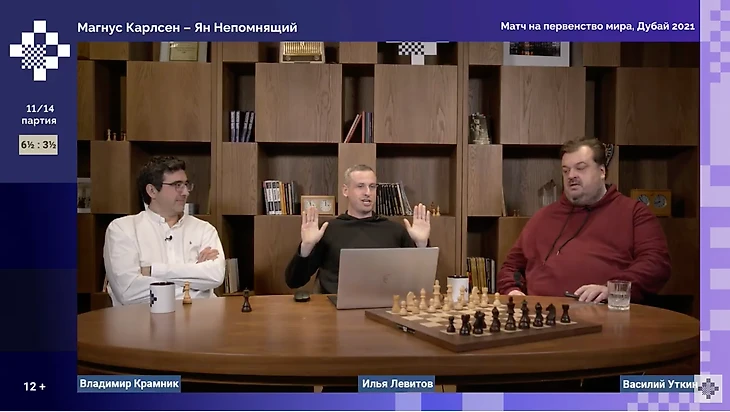 15:25. Сегодня на канале Levitov Chess особенный гость – лучший футбольный комментатор страны Василий Уткин. Шахматы для него внове, но знакомство с Яном Непомнящим и его делает немножко шахматистом. Так что не ждите от него анализа происходящего на доске, зато историй и конферанса мы наверняка услышим немало. А ассистировать ему будет 14-й чемпион мира Владимир Крамник – без него за последний год просто невозможно представить себе студию Ильи Левитова.