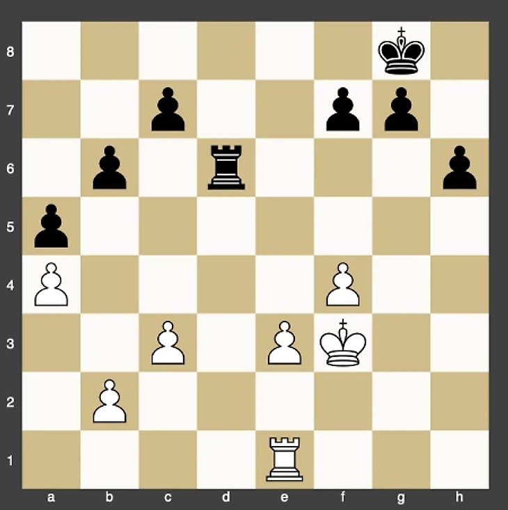 18.25. Игра тем временем продолжается: 34...Rd2 35.Rb1 g6 36.b4 axb4 37.Rxb4 Ra2 38.Ke4 h5 39.Kd5 – куда бежит белый король? Если представить, что он съест пешки черных и протолкнет проходную «a», черные успеют образовать связанные: 39...h4 40.Kc6 h3 41.Rb1 h2 42.Kxc7 f6! 43.Kxb6 g5! 44.fxg5 fxg5 45.a5 g4 46.a6 g3 47.a7 g2, и белым можно сдаваться. А ведь они могут играть и тоньше...