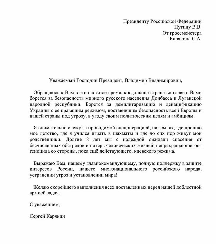 27 февраля 2022 года через 3 дня после начала того, что рекомендуется называть «специальной военной операцией» международный гроссмейстер Карякин Сергей Александрович (текущий рейтинг 2747, № 17 в мире) опубликовал письмо с поддержкой действий России и лично президента Владимира Владимировича Путина.