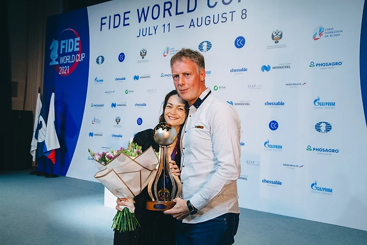 А в 2021 году она прибавила себе еще два звонких титула! Летом стала победительницей первого женского Кубка мира: если бы этот нокаут-турнир существовал в своем прежнем виде, то Костенюк стала бы первой двукратной чемпионкой мира… Ведь никто до нее еще не побеждал дважды в этих американских горках без права на ошибку, еще с разрывом в 13 лет между двумя победами. Между ней и победой стояли: Кори, Крамлинг, Музычук, Гунина, Тань Чжунъи и лидер рейтинга Горячкина. В своих лучших традициях Александра выиграла у всех в классику, ни разу не позволив перевести борьбу на тай-брейк.