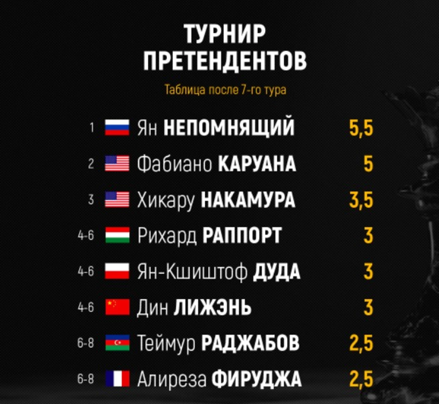 Российский шахматист продолжает лидировать, но американец по-прежнему рядом. Уже завтра начинаются партии второго круга. Турнирная таблица по итогам седьмого тура
