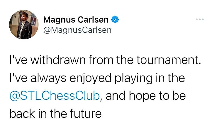 Перед началом 4-го тура Сент-Луиса произошло что-то невероятное. В твиттере Магнуса Карлсена появилась короткая запись: «Я вышел из турнира. Мне всегда нравилось играть в Сент-Луисе, надеюсь вернуться в будущем», после чего норвежец не вышел на партию с Мамедьяровым, а все его результаты были удалены из таблицы Sinquefield Cup 2022.