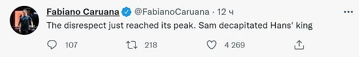 Жест Севяна восприняли как очередной демарш в сторону Ниманна, которого сейчас модно травить. Лидер турнира Фабиано Каруана написал в твиттере: «Неуважение достигло пика. Сэм обезглавил короля Ханса».