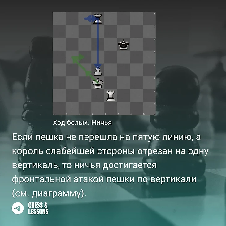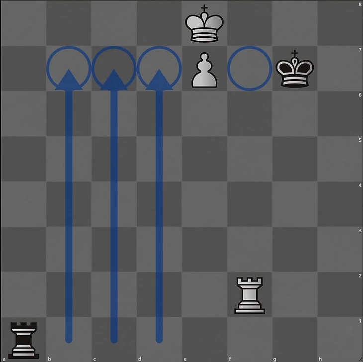 - ладья слабейшей стороны не успела занять шестую линию, но тем не менее в данных позициях ничья достигается, если пешка расположена не на вертикалях "b" или "g. Черный король должен прятаться от шахов на "короткой" (считая от пешки) части доски, оставляя другую "длинную" (минимум 3 вертикали от пешки) сторону для своей ладьи.