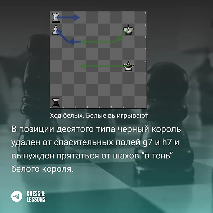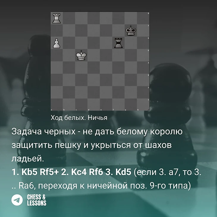 Та же позиция, что и в 5-м типе, но уже ход черных. Слабейшая сторона добивается ничей с помощью флангового нападения ладьей на короля (шахи по горизонталям).