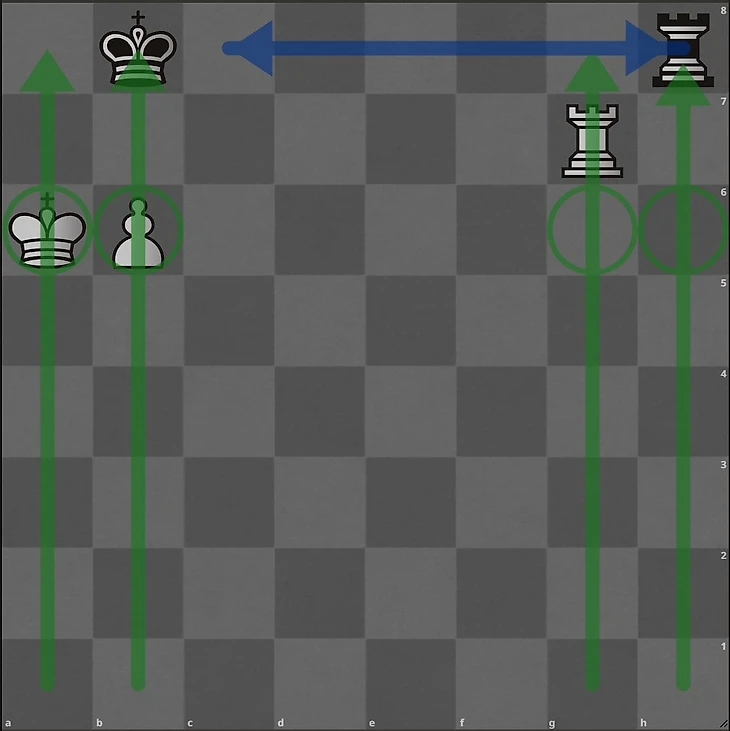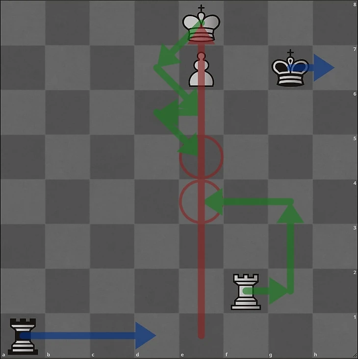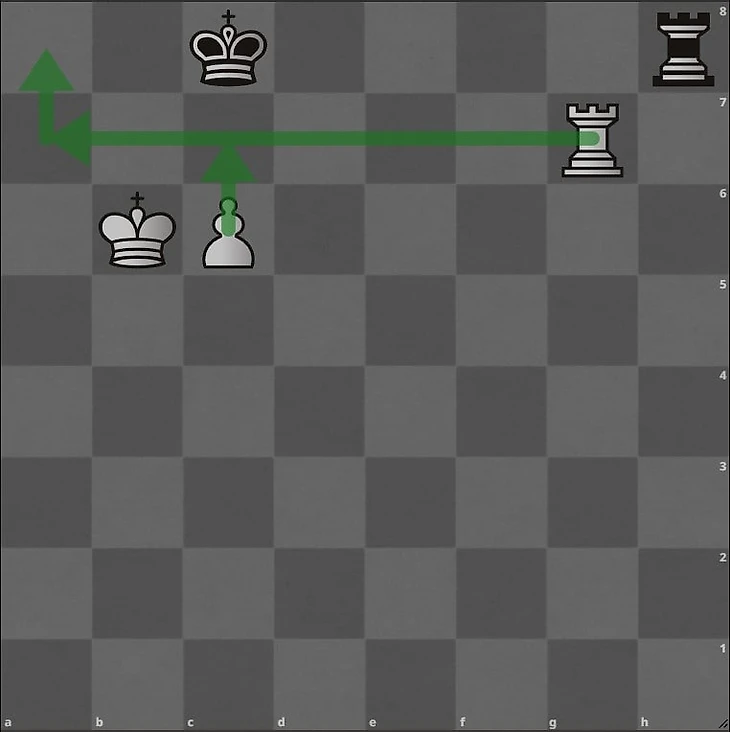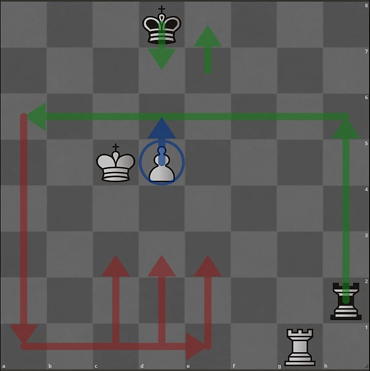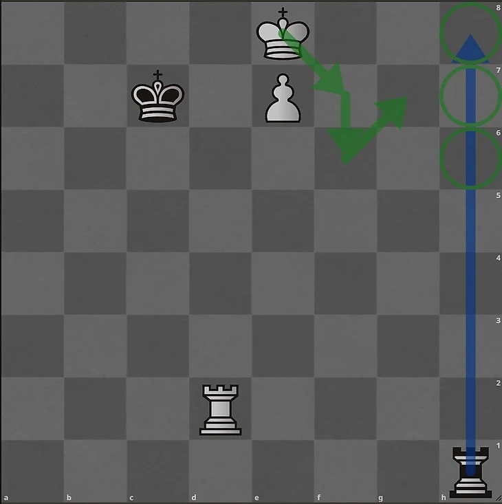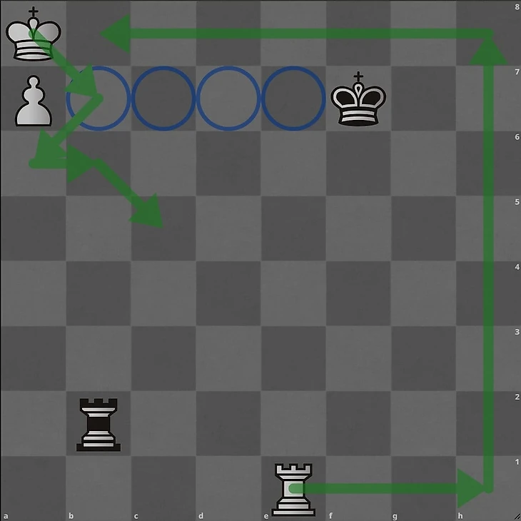 Черные смогли сделать ничью из-за того, что между белой пешкой и черной ладьей было достаточное расстояние. Для достижения ничьей необходимо, чтобы расстояние между ладьей и пешкой противника было не менее трех полей по горизонтали. В этом случае говорят, что черная ладья находится на длинной стороне доски, а черный король - на короткой.