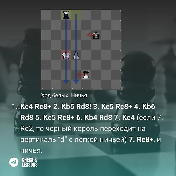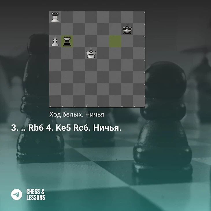 1. .. Rh6 2. Rg8+ Kd7 3. Rg7+ Kd8 4. Kd4 Ra6 5. Ke5 Rb6 6. d6 Rb1❗️7. Ke6 Re1+ 8. Kd5 Rd1+ 9. Kc6 Rc1+, ничья т.к. от шахов не скрыться. От пешки далеко белый монарх уйти не может, т.к. черные сразу нападут ладьей на пешку d6.
