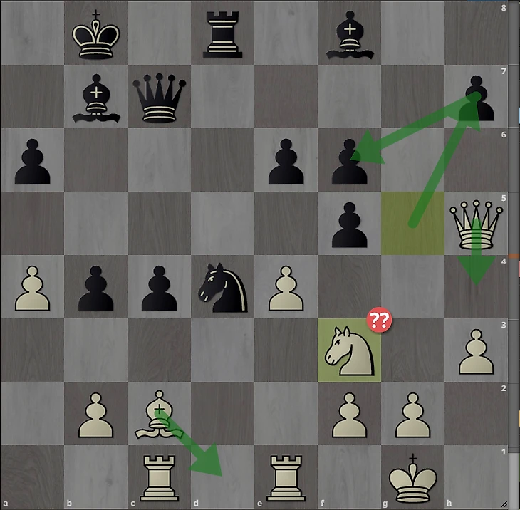 После очередной ошибки 23. Nf3?? Дин уже мысленно смирился с поражением: сильнее было забрать на h7 - 23. Nxh7 и далее увести слона белопольного, чтобы оставить защитника белых полей на ферзевом фланге (см. диаграмму №4).