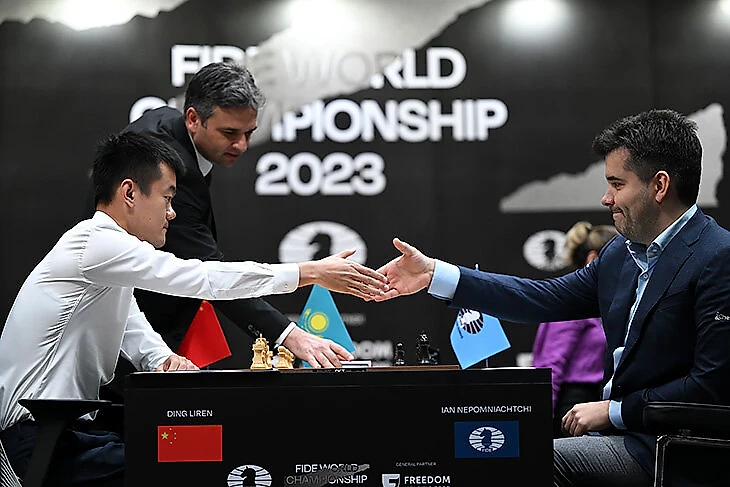Дин признал, что ход h3 придумал секундант. Но к продолжению партии в этом дебюте китаец оказался не готов. Комментарии Дина на пресс-конференции вообще были предельно краткими, и кажется, не только из-за эмоций. Перевода в Астане нет, а в знании английского языка Непомнящий очевидно превосходит соперника.