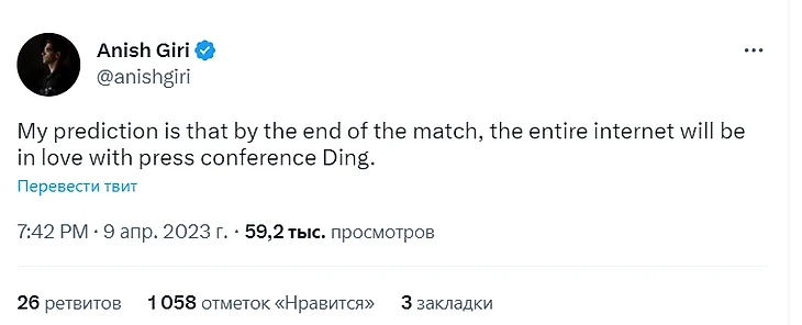 В первый день над китайцем даже улыбались. «Мой прогноз: к концу матча весь интернет будет влюблен в пресс-конференции Дина», – написал нидерландский гроссмейстер Аниш Гири.