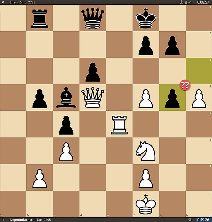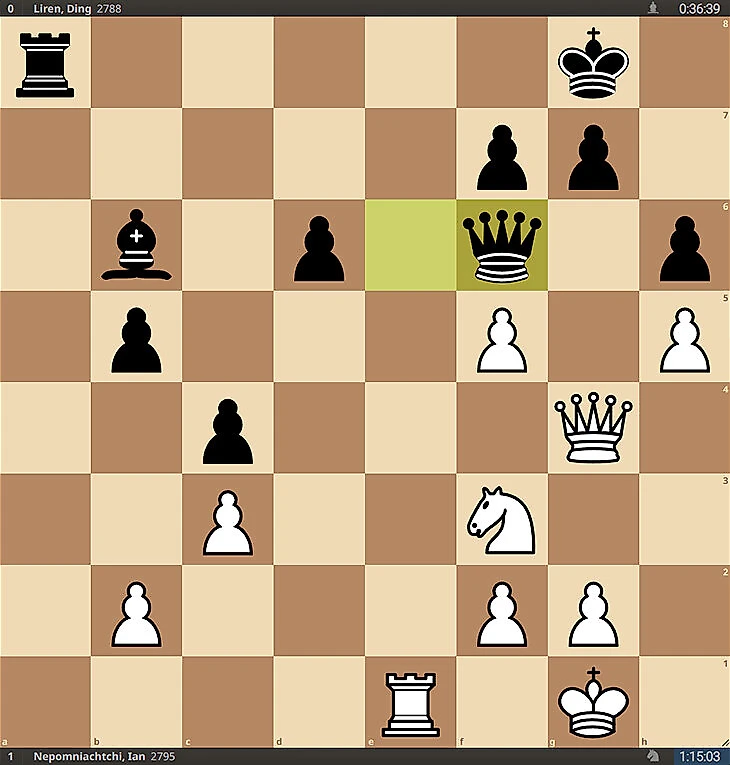 После того, как Непомнящий побил коня пешкой на f5, лучшим вариантов для черных было отойти ферзем на d7. В этом случае была бы абсолютно равная позиция. Вместо этого Дин ушел на f6 и отдал преимущество Яну. Непомнящий вторгся ферзем и стал доминировать.
