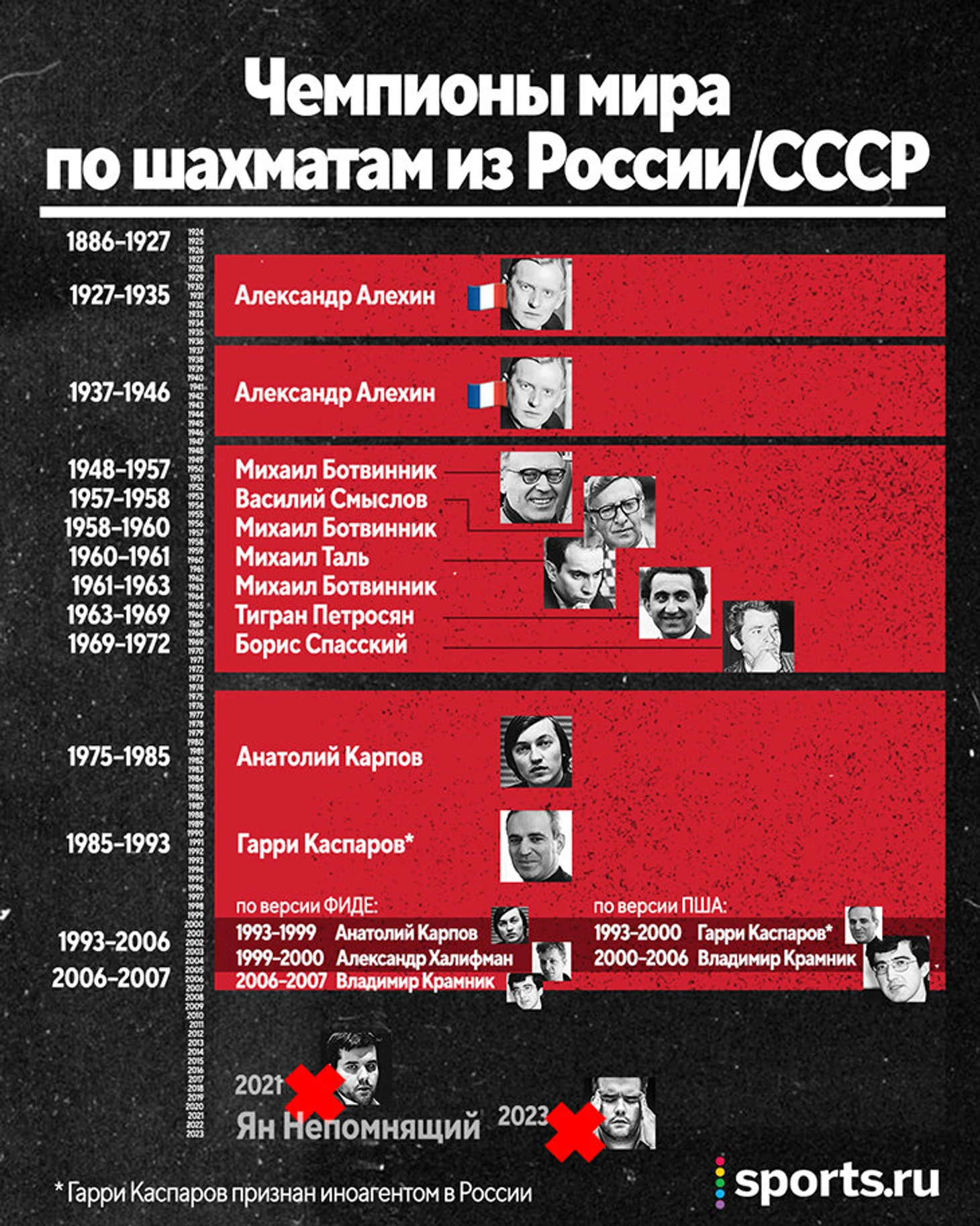 • Официальные матчи на первенство мира проводят с 1886-го. Непомнящий мог бы стать 11-м чемпионом из России. Пара уточнений: формально Ян забрал бы титул под нейтральным флагом, а первый русский чемпион Александр Алехин выигрывал под флагом Франции.