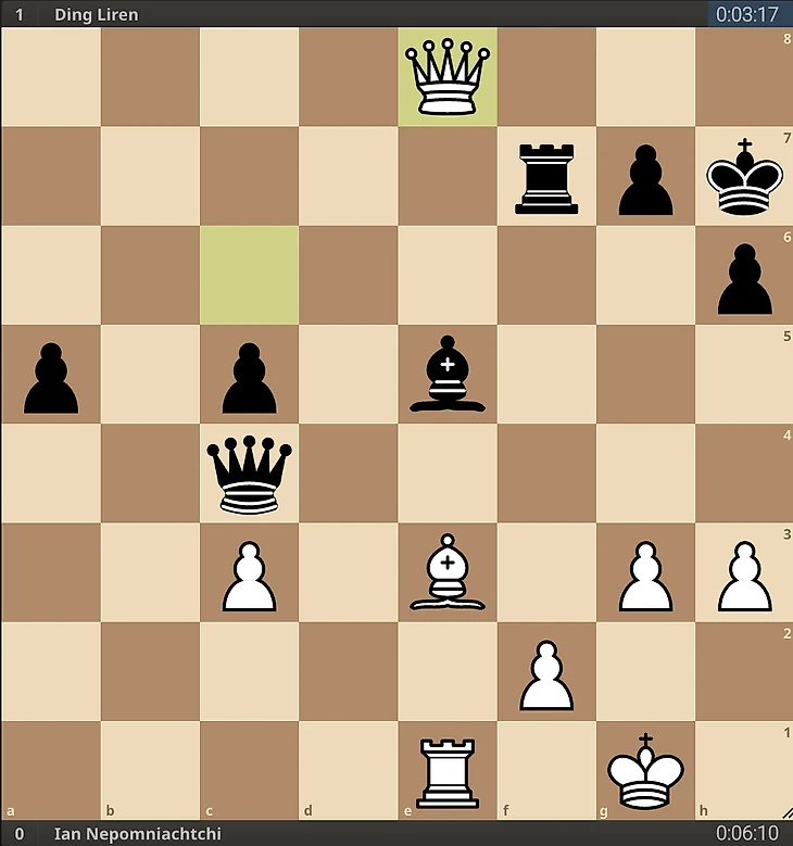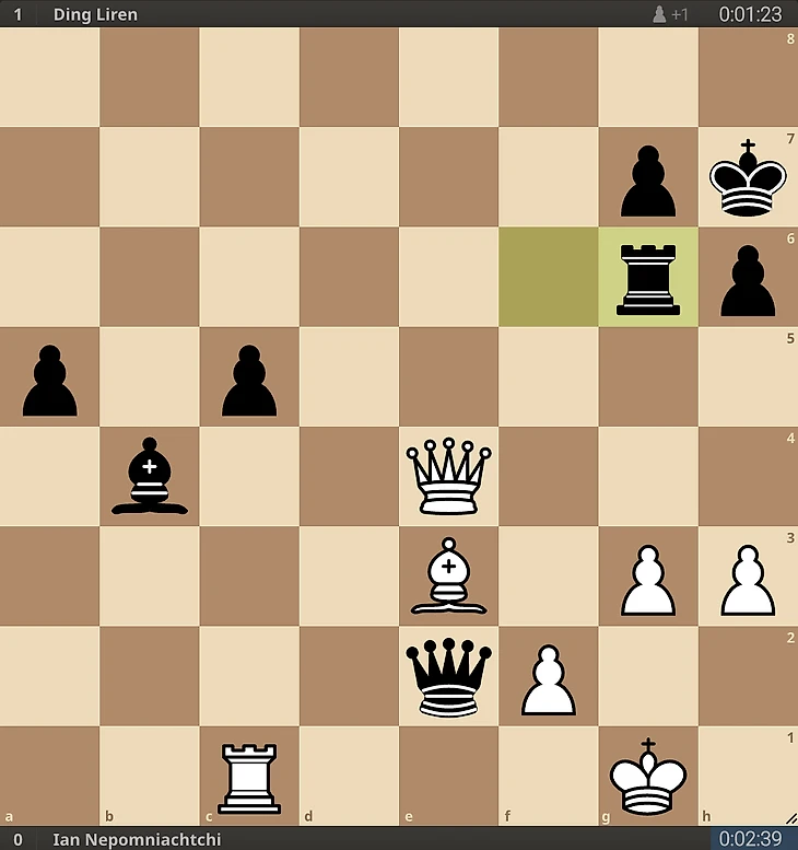 Дин сделал ход Лg6, закрывшись ладьей из-под шаха. Обычно такие ходы тоже не хочется делать на флажках, но китаец снова сыграл дерзко. Видимо, это смутило Яна. А дальше начались нервы, ошибки, Дин получил лишнюю пешку, которую уже только оставалось реализовать...