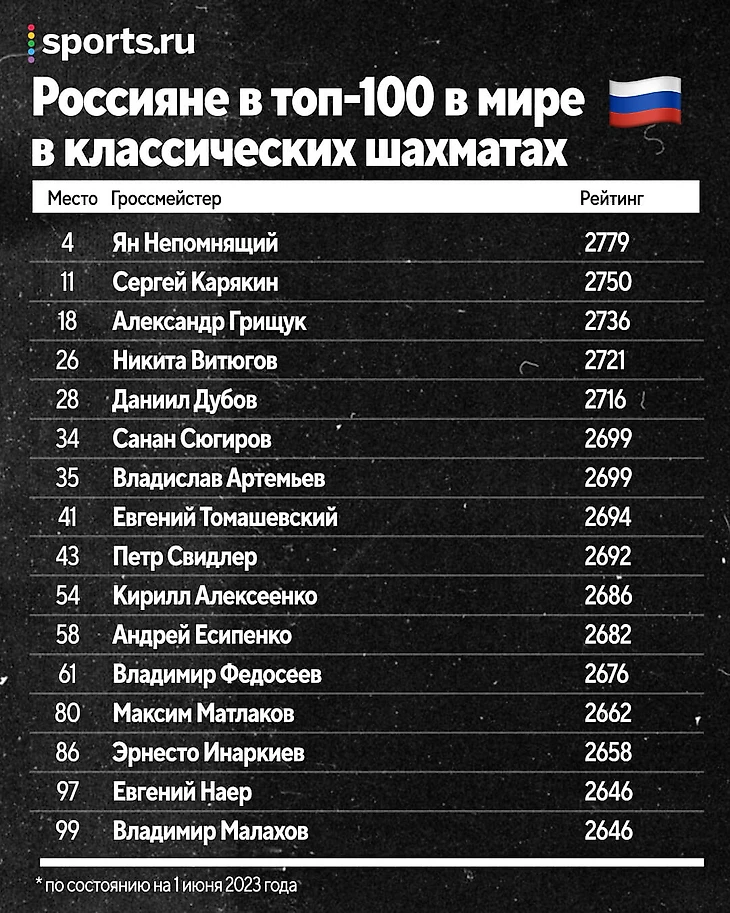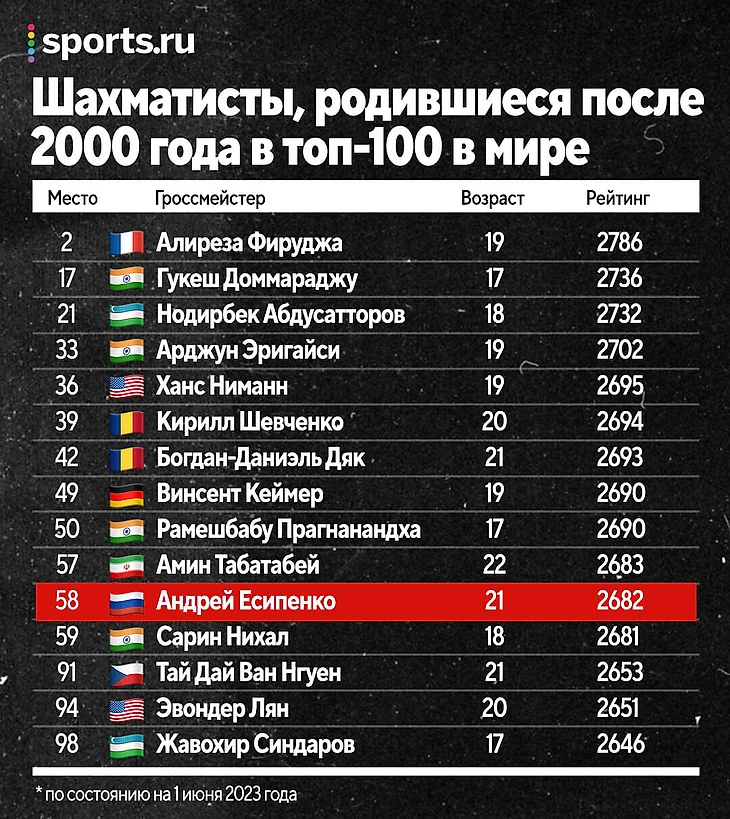 По состоянию на 1 июня у нас получилось даже меньше, чем у Левитова – 18 человек. Из них Россию представляет только один – Андрей Есипенко на 61-й позиции. Он считался огромным талантом, два года назад обыгрывал Карлсена, но в последнее время его прогресс замедлился.