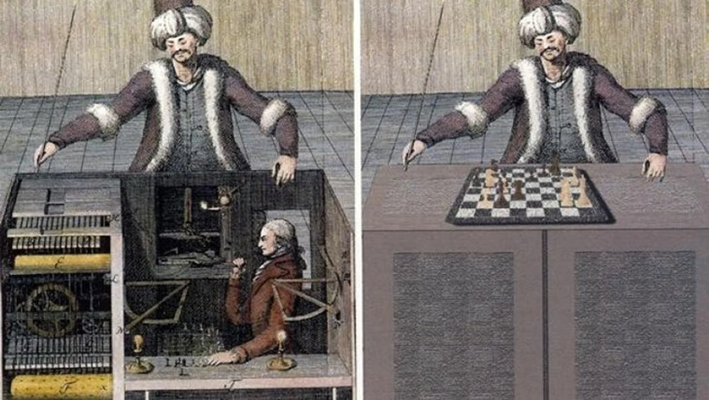 И это одна из ярких мистификаций того времени. На самом деле «Турком» управлял человек, который прятался в столе. Так как отсеков было несколько, Кемпелен часто демонстрировал «прозрачность» своего изобретения: пока он открывал одно отделение стола, шахматист находился в другом, потом перемещался. Во время игры он определял текущую позицию на доске благодаря магнитам, прикрепленным к фигурам снизу, а затем совершал ходы, используя рычаг.