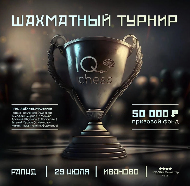 Друзья, рады сообщить, что совсем скоро, уже в эту субботу, 29 июля в 11:00, состоится турнир по шахматам в г.Иваново. Наш партнёр - гостиница «Русский Манчестер» приглашает к себе участников и гостей турнира.
