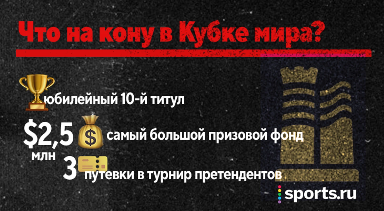 На кону в Кубке мира – рекордный призовой фонд в 2,5 миллиона долларов. Победитель заработает 110 тысяч долларов, финалист – 80 тысяч. А еще три лучших шахматиста (кстати, впервые на Кубке мира сыграют матч за третье место) получат путевки в турнир претендентов.